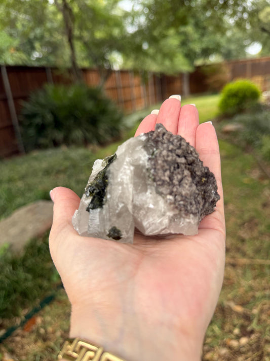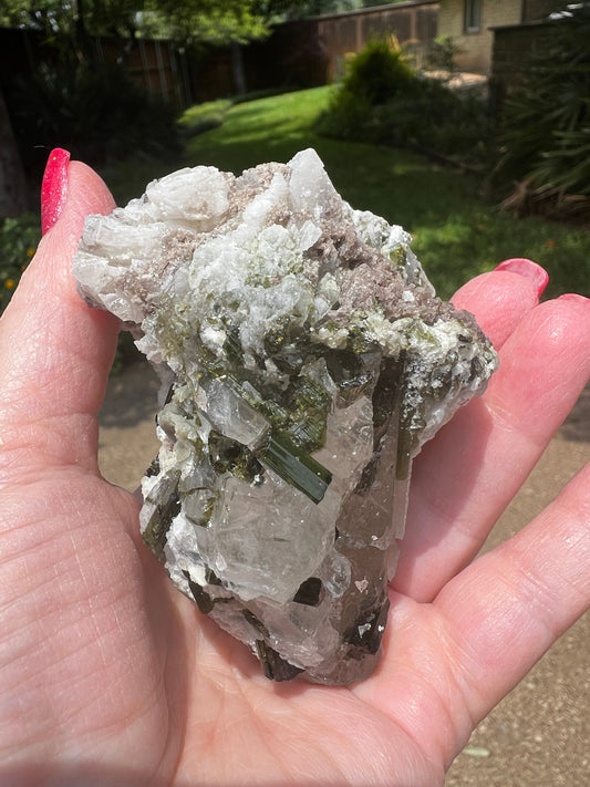 Large Green Tourmaline in Quartz with Lepidolite sugar bed, stunning raw altar piece 10 oz sparkly fairy bed, high vibration crystals, 3.5”