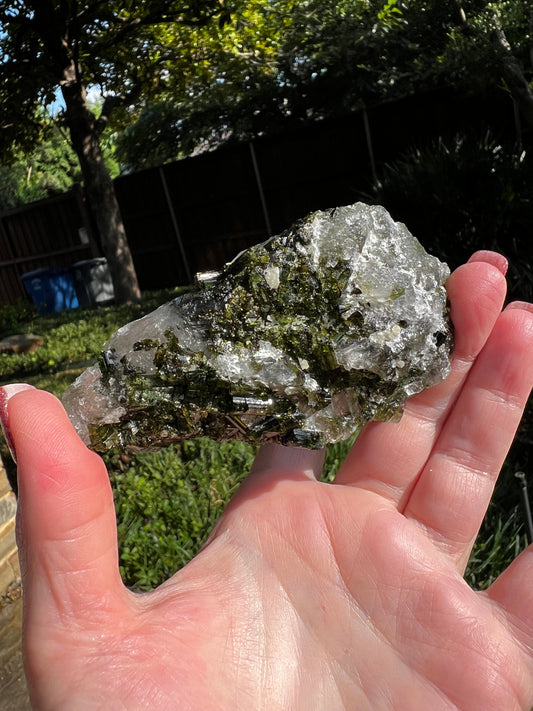 Large Green Tourmaline in Quartz with gorgeous rod crust, stunning raw altar piece 1.9.4 lbs, high vibration crystals, 4.5”