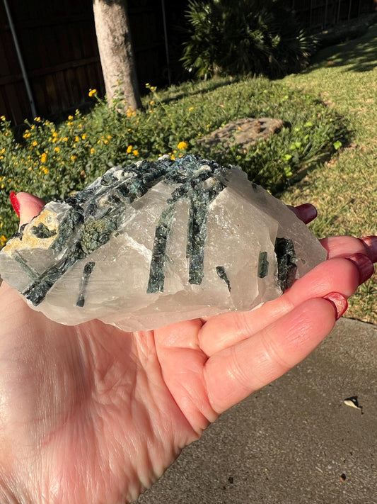 Large Green Tourmaline in Quartz with gorgeous rod crust, stunning raw altar piece 13.5 oz, high vibration crystals, 4”