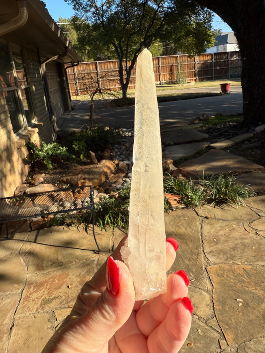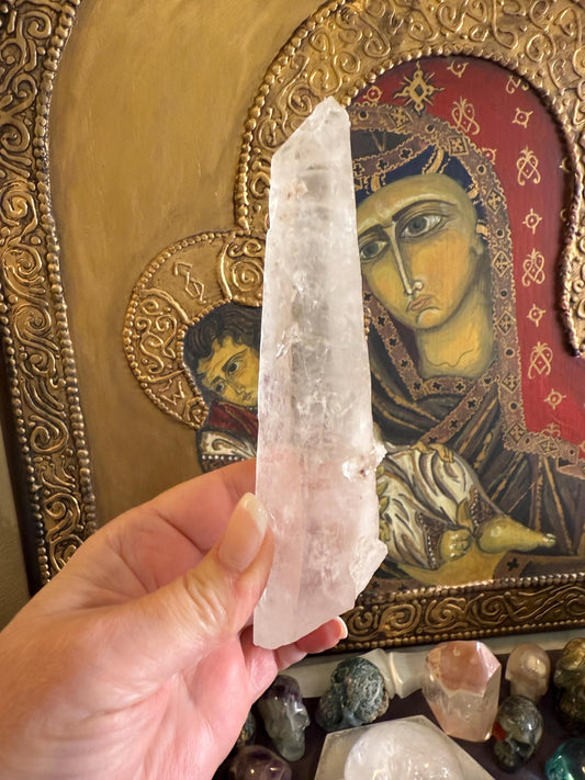 Laser Sugared Lemurian Witch’s Finger Wand, 5.75”, crown bottom, gift, high vibration crystals