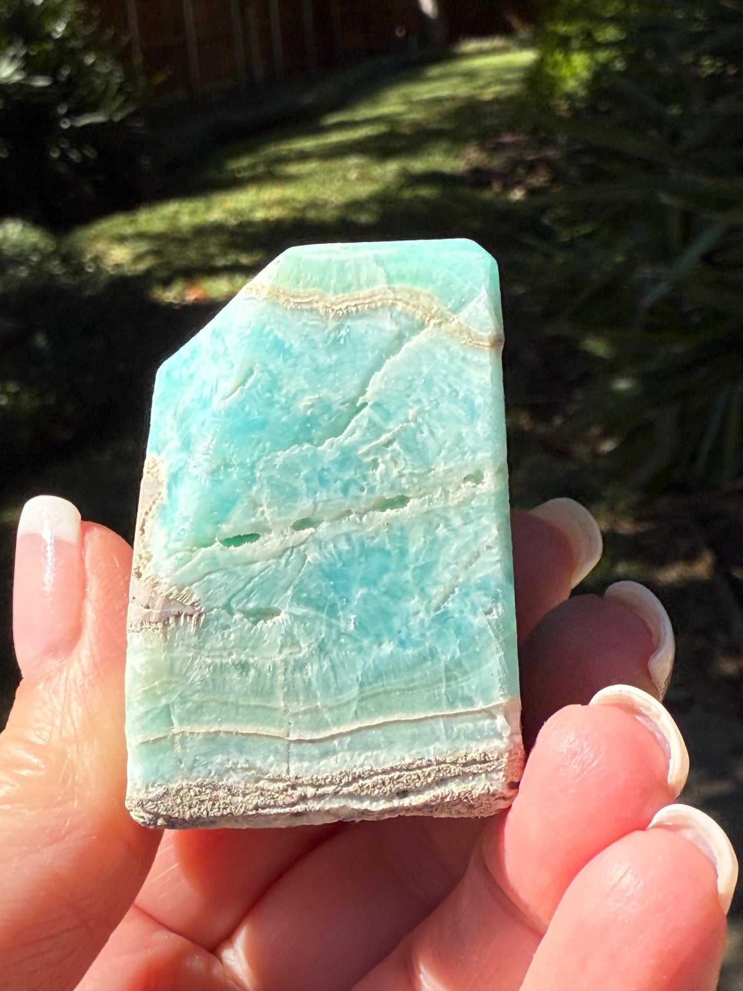 Blue Aragonite raw chunk, new in shop. It is rough underneath, part of being pulled fresh from the earth. It has little caverns. Chunky at 1.75x1.1”. A seafoam piece of heaven and earth, very calming and throat chakra. I feel the sea with it, and a water sylph and mermaidian influences. A wonderful tower or generator.