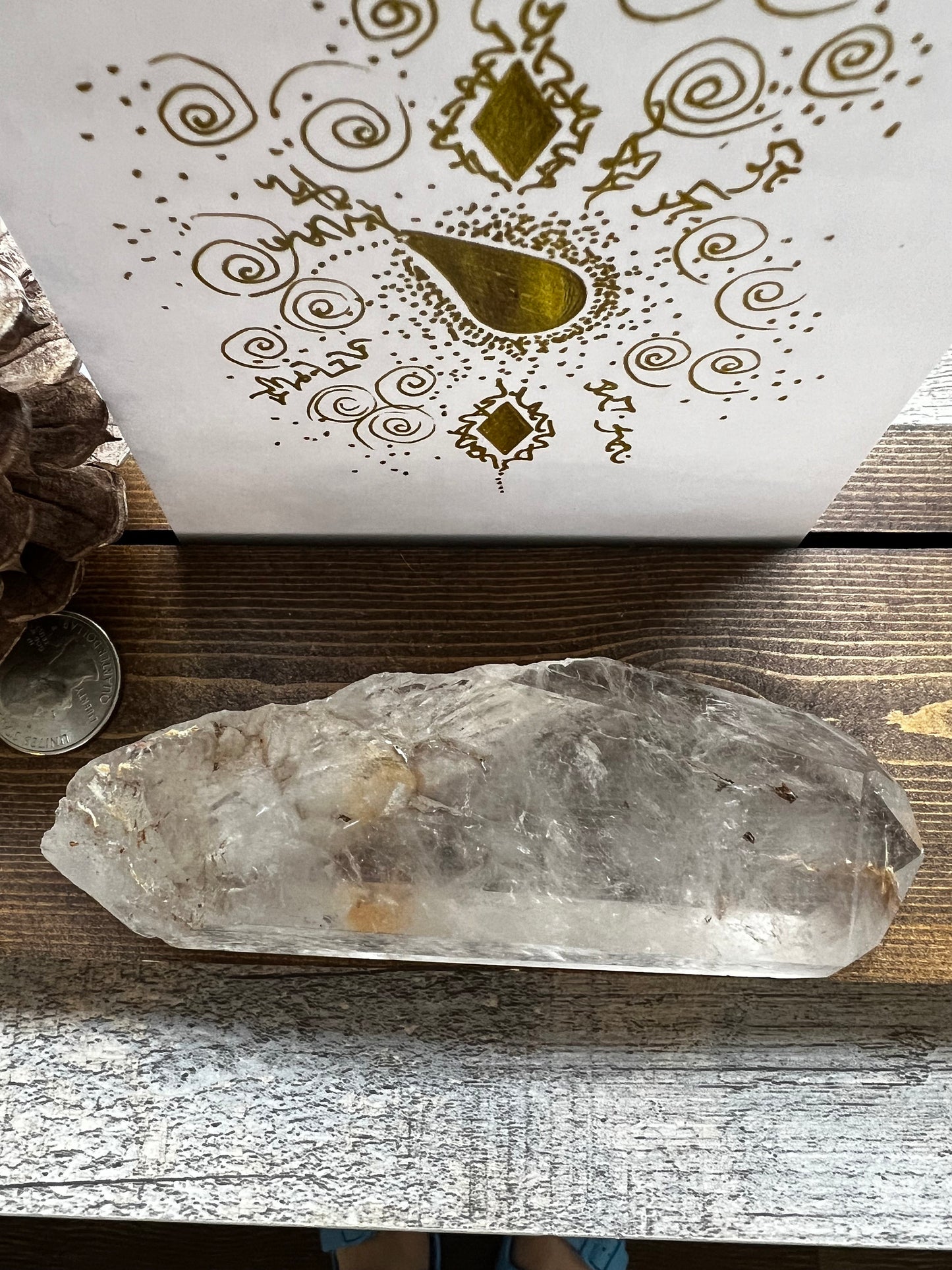 Citrine polished wand of rare and magickal beauty. This is a strong manifestation piece corresponding to the Justice card in the tarot, this is a wise elder. If you love feng shui, you might consider placing him in the southeast corner of your home. For me personally as well, I would not miss the chance to use this wand for grid and layout work and to activate your abundance gene. There are some silver wings of light inside and a tiny rainbow. Stroke the glyphs as you relax and see what information codes comes to you. When you need energy, place him on your abdomen (solar plexus chakra). Though citrine usually clears naturally, I would still give him a cool rinse from time to time and a kiss, or a drop of essential oil in gratitude. This piece came in with elestial citrine but is so mysterious as the color shifts from more yellow to white that I feel it is more of a root citrine that broke off a ledge. From Morro Redondo Coronel Murta, Brazil.