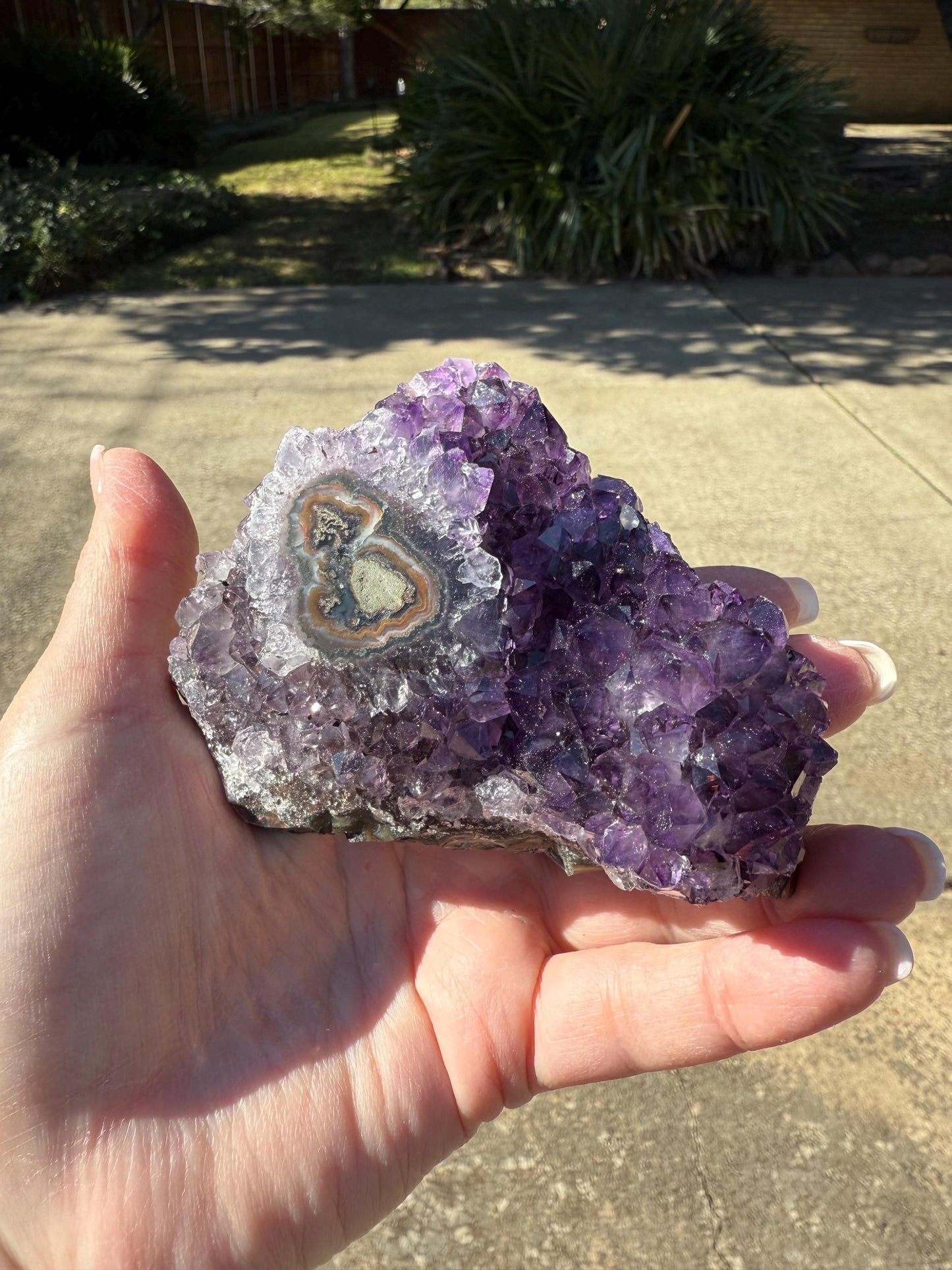 Deep Purple Galaxy stalactite eye amethyst sparkly bed, very beautiful in energy and so sparkly! I love stalactite eyes! Its like looking into the eyes of Mother Gaia to me. I love the different colors of sparkly amethyst, and this color is so pretty. This is a large, heavy piece at 10.7 ounces, with tiny rainbows and a beautiful mountain of amethyst crystals at one end.