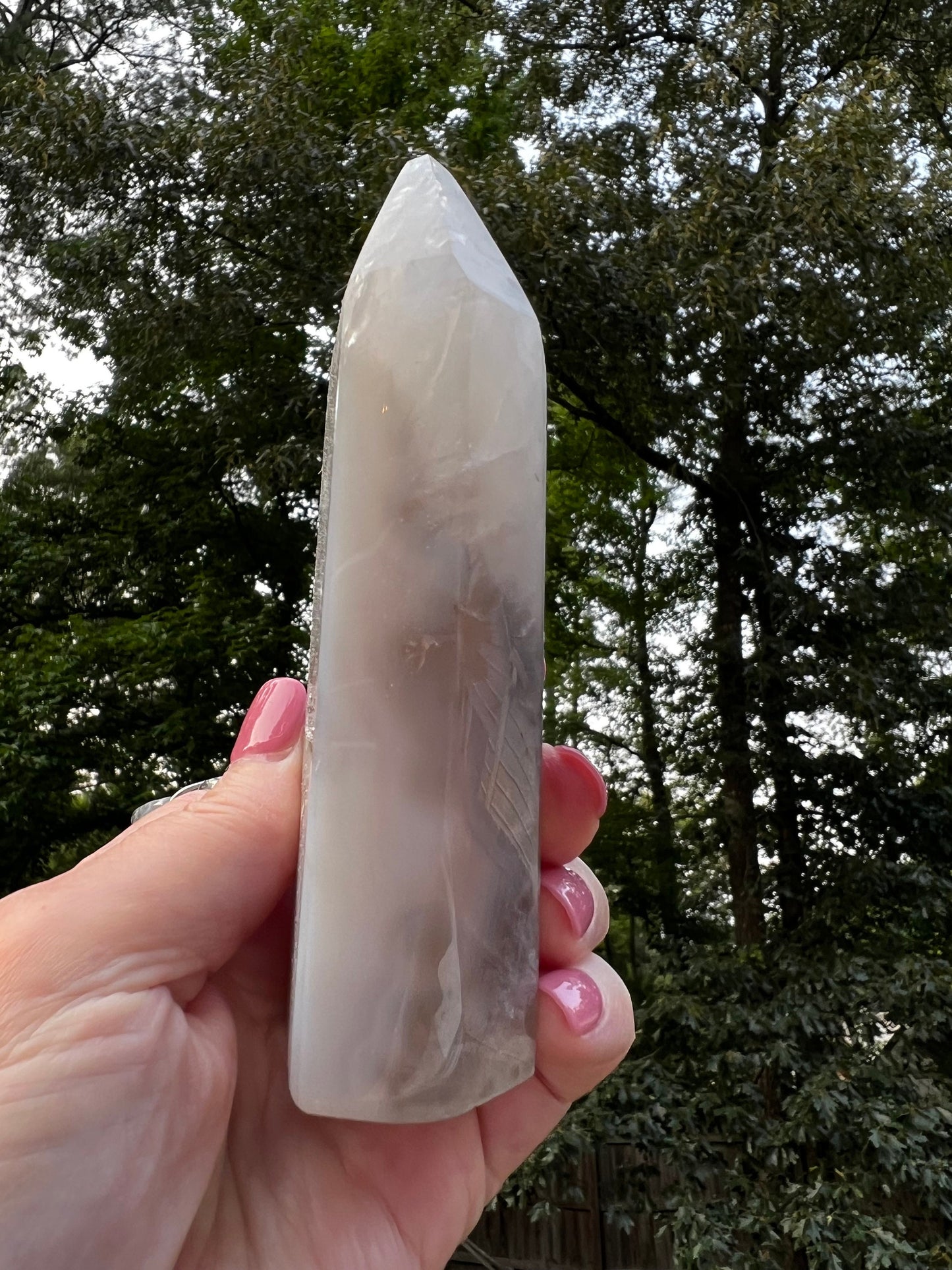 Druzy agate tower, 4.9” tall, lavender patterned agate. I’ve always wanted to carry some agate in my shop and this is sublime, everything I hoped for and more. One large druzy pocket in a beautiful heavy carving for your altar or sacred space.I love the color of it, it reminds me so much of wildly shifting landscapes. It is flashy and beautiful.
