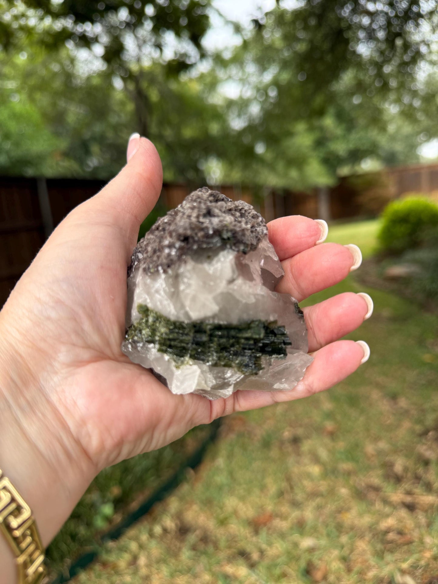 Large Green Tourmaline in Quartz bed in this stunning fairy altar piece— look at all the tourmaline! The scattering of premium tourmalines are so amazing - look how many! It’s truly emerald green tourmalines adorned by a lepidolite sprinkled formation. This is a combination stone of the heart, it wishes to elevate you and your space. This is the kind of piece that makes my heart sing, that I would keep in a bedroom or on my desk so I could see it all the time and enjoy its beauty. Look how packed it is! Over half a pound.