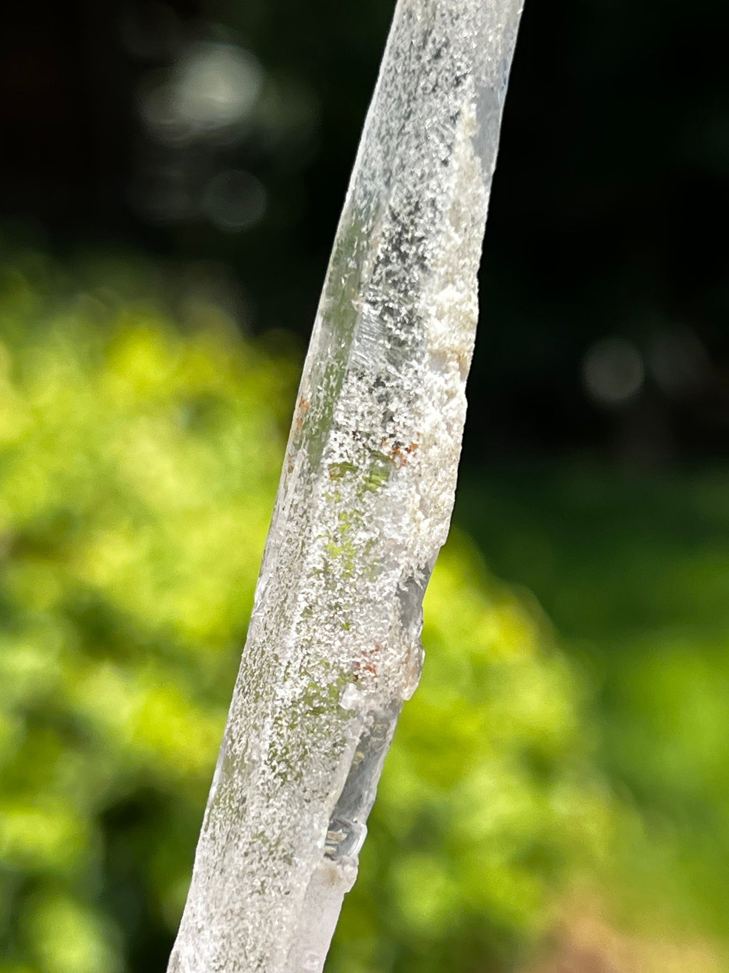 Laser Lemurian Singing Lemurian wand witch’s finger, a sort of a crown bottom, and beautiful sugaring. I was really lucky to be able to grab this lot from my special Brazilian vendor. This wand is ready to go to work in grids, body layouts, travel, etc. It’s the perfect size for magick, for intuitive healing, for bringing in joy and abundance. You know when you hold a piece if it’s been cared for and if its wisdom has been trusted. The crystals in my home are allowed to soak in the healing of my prayer and healing room, and if they wish, they may share their wisdom with the healing temples and schools I have for dragons and skulls. These have been here over four month in the temple, resting and sharing. Snow and a clear window side shows its keeper holy energies and directs them into you and the earth, if you wish to accept. There’s some iron oxide sacral energy in this piece, a golden healer energy. Gorgeous. This is a light and airy wand, flick gently with your fingernail or another crystal for song.