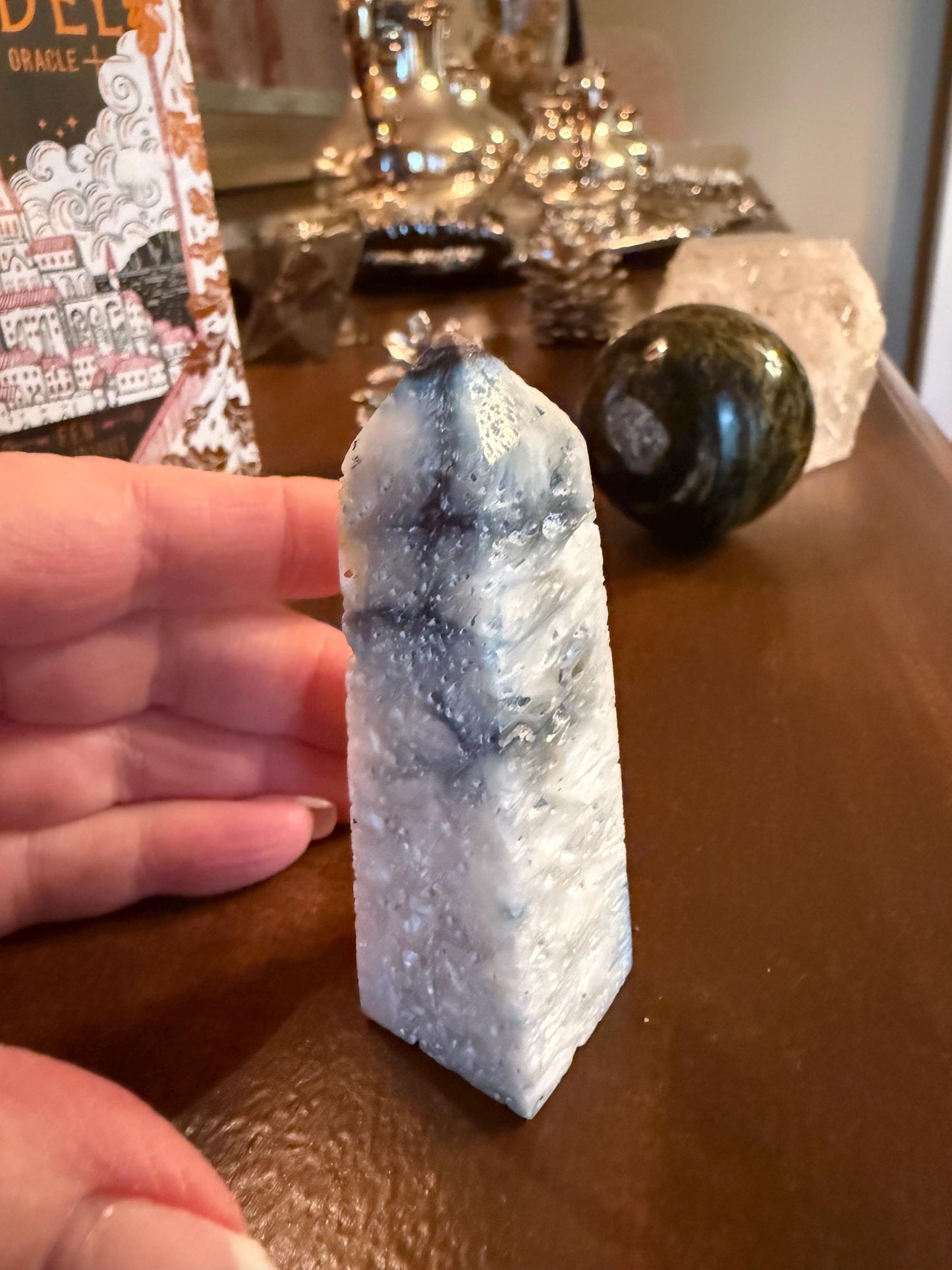 Nakauriite tower, 3”. I love the colors in it. This is a beautiful material. This material is popular and somewhat rare, and I’m lucky to get some in. It has kind of a coarser texture to it. This is natural and authentic Nakauriite or blue ice, it’s a fairly new crystal energy that has come forward now to assist the planet and her people, and I feel strongly it is an assist to Lightworkers and water element souls everywhere. Some people call it Blue Ice or Glacierite, these are from Java, one of the few places it can be located. This one is a very soft luxurious collection of patterns and colors in it, it feels very starry, even though it we have no light today due to storms.
