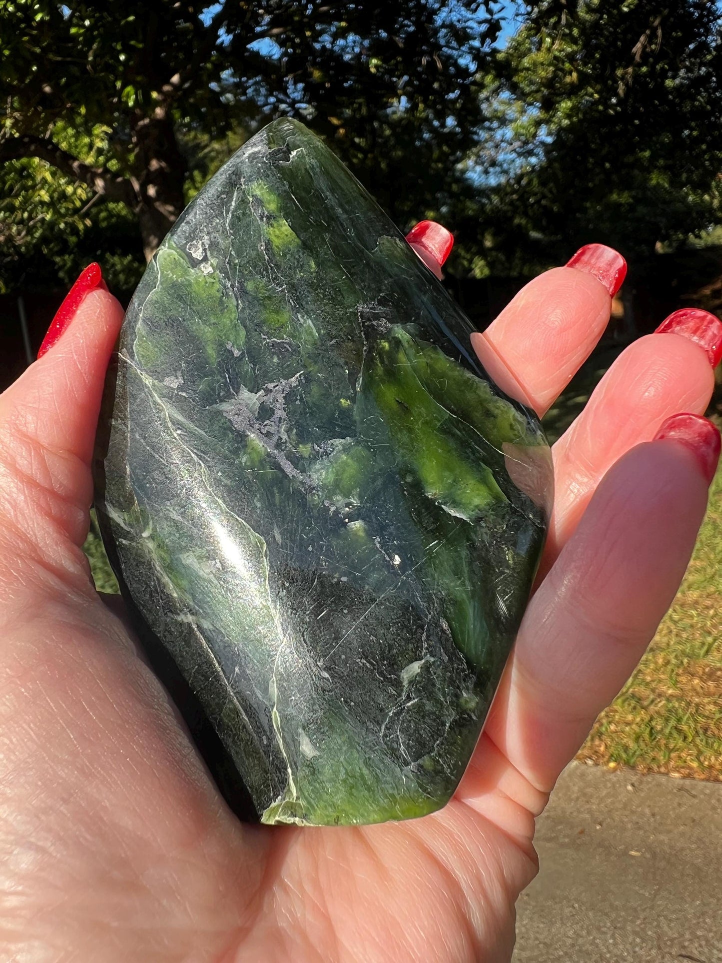 New Serpentine polished flame statement piece, new in shop and gorgeous. At 7.5 ounces, this is nearly half a pound of foresty green dragon energy. An absolutely gorgeous piece of such high quality serpentine that glows darker in sunlight. It’s a deep green like jade, very velvety but for one spot that is rougher where the carver thankfully didn’t polish it smooth. I would not stand this piece if you have kitties because I’d be afraid of knocking it over. Simply a AAA treasure for your heart chakra and your physical wellbeing. Some people call this serpentine jade. How much love do we have for the fairies, Green Man, and other beings of the green? This is such a green ray piece celebrating and activating healing. It’s like have a jade tree in your home! I feel a green dragon around this piece. This is a delicate, wispy polished piece with beautiful patterns.