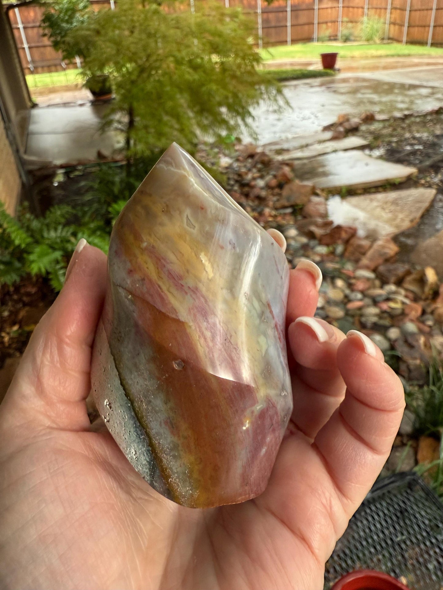 Ocean Jasper flame of lovely beauty. I adore Ocean Jasper and this piece is so sweet. Ocean Jasper never fails to make me happy. The colors are like an earth party. This flame is cut uneven on the bottom so that it does not stand. It’s gorgeous material and I feel the carver did his best to keep as much as possible. Still, it’s been pouring here in Dallas today so she asked to be placed in the fresh rainwater for refreshment. She has such gorgeous patterns with vugs and a pink dragon accompanies.