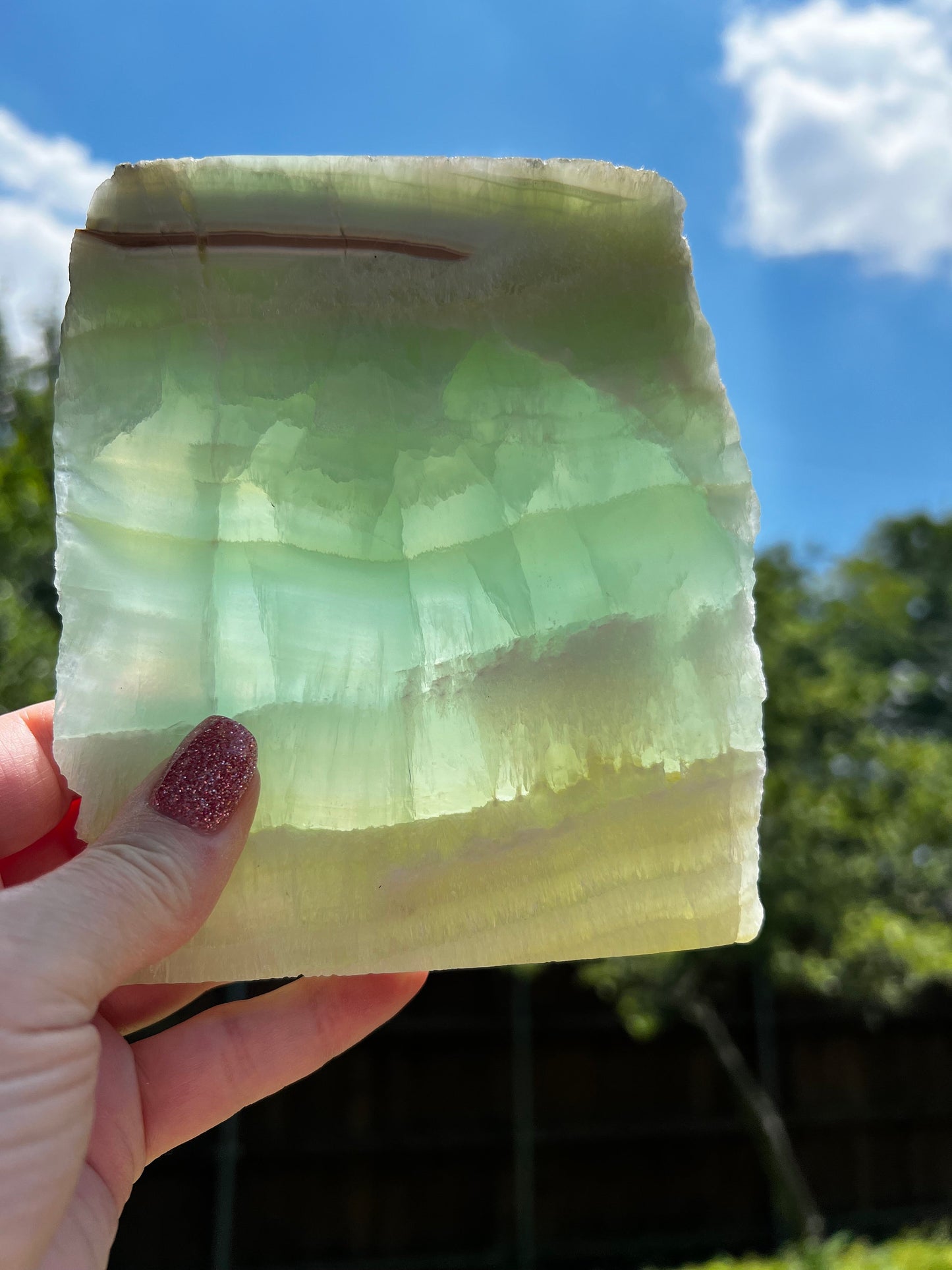 Pistachio Calcite Raw Slab or slice, 5.25x4.5x.5” Beautiful minty colors. Use sage or incense to clear or even set it on selenite. This has a soft gentle feel to it and reminds me of a slice of minty fields. The striations are beautiful in this thick slice. It feels so elven and green dragon, very comforting. I love pistachio calcite in all its forms! Very much a heart chakra stone. 🪷 1.4.8 pounds