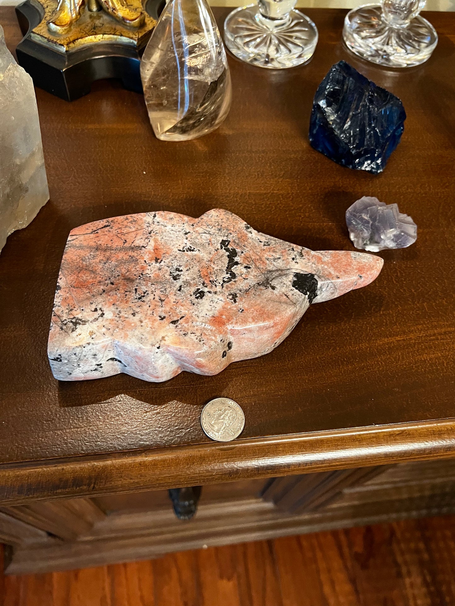 Rhodonite slab freeform, a very beautiful heart chakra piece from Pakistan. This freeform is wonderfully colored and quality, all natural and polished lovingly. It’s sort of trapezoidal in shape, and nicely thick. This is a piece you can put crystals on or sleep with beside your bed for higher healing during dream time. It leans when it’s on its side but not standing like a tower. I would not stand it as it is such an irregular shape. It is a glorious piece!