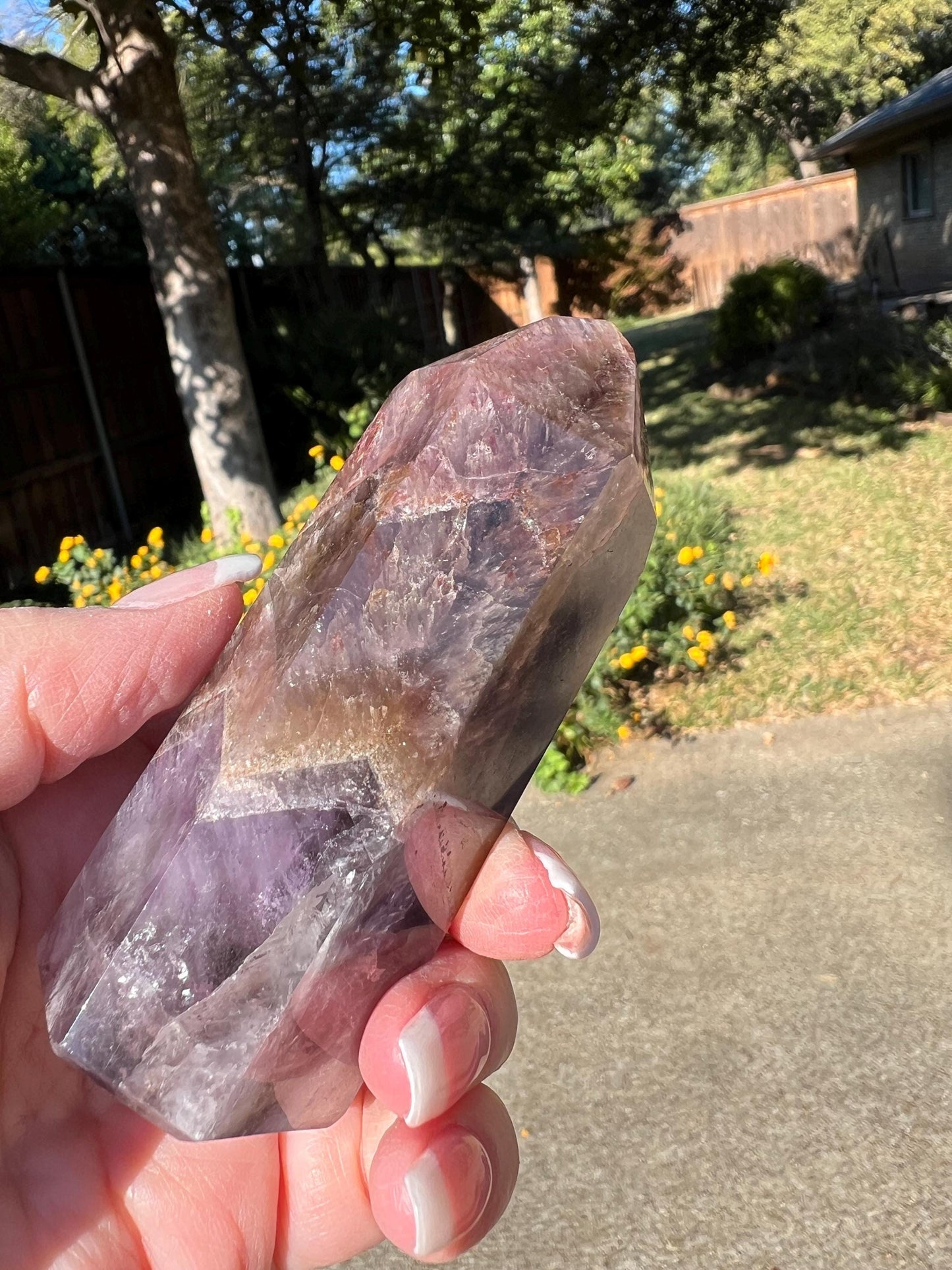 Super 7 point with beveled bottom and beautiful color. I adore Super 7. When I want a crystal that does it all, I reach for Super 7. You know I am a fan of amethyst, especially for headaches, and Super 7 has amethyst as well as six other crystals-hence, Super 7. Some folks don’t wish to understand the medicine of crystals, but Super 7 is one that for me defies that “logic.” This can be a generator for your intentions in your sacred space. This one has beautful depth of color, really pretty and unique.