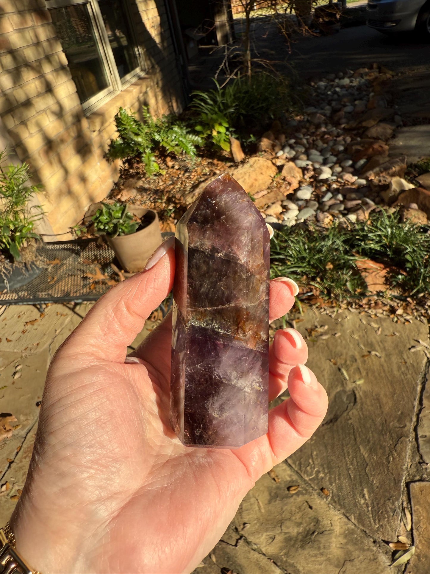 Super 7 point with beveled bottom and beautiful color. I adore Super 7. When I want a crystal that does it all, I reach for Super 7. You know I am a fan of amethyst, especially for headaches, and Super 7 has amethyst as well as six other crystals-hence, Super 7. Some folks don’t wish to understand the medicine of crystals, but Super 7 is one that for me defies that “logic.” This can be a generator for your intentions in your sacred space. This one has some beautful depth of color and a few twinkles of rainbow light. Beautiful!